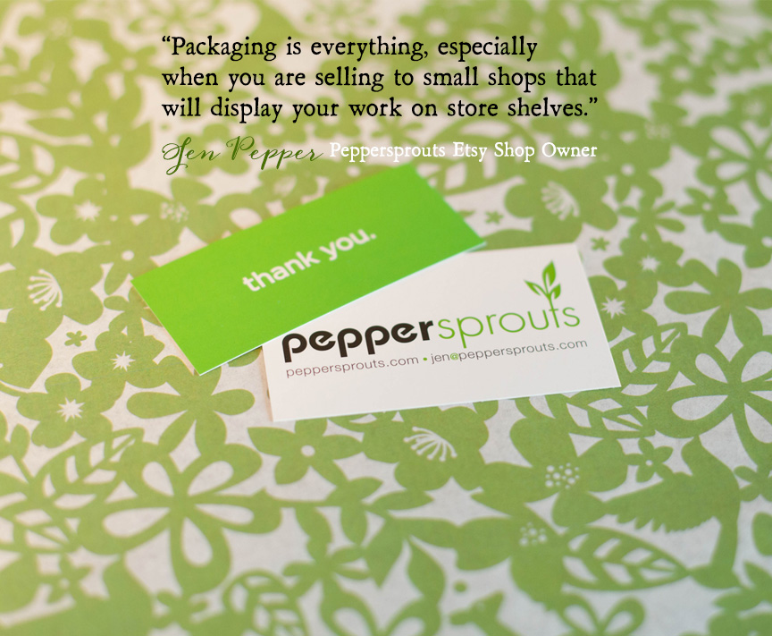 Since we love Etsy shop owners, we’ve decided to occasionally feature a few who have put our custom tissue paper to good use. While searching for holiday packaging and advent calendars, we discovered modern woodland inspired works of art at Peppersprouts by artist and designer Jen Pepper. We fell in love with everything in her shop, from her keepsake gift tags to her ornaments to her coasters. We love the animals she’s brought to life. And we especially loved her incredibly planned, designed, and giftable packaging. We sat down with Jen to discover what inspires her, success tips for Etsy sellers, and more.