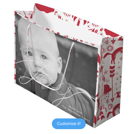Consider a custom gift bag to show off your family photo or to celebrate a baby who was born this year. Or imagine the squeals of joy from your kids if each one has a personalized bag under the tree from Santa on Christmas morning!