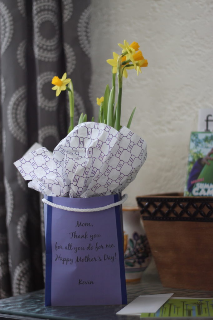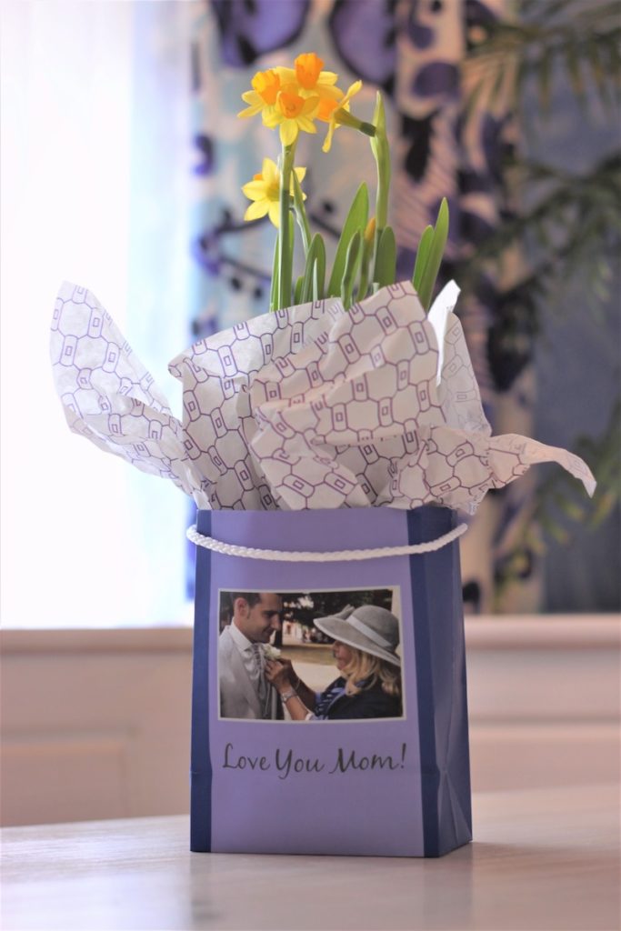 We are innovating products every day, and our next bag is coming out soon. For a sneak peak, we are presenting another out-of-the-bag idea just in time for Mother’s Day. Elevate flowers to a new level by personalizing the package using this 5” custom gift bag. The flowers, which came in a 4” pot and are available in most grocery store floral departments, have a plastic liner that fits perfectly into the gift bag. This gives mom, or anyone special in your life, the perfect reason to hang onto and display the bag for all to see.