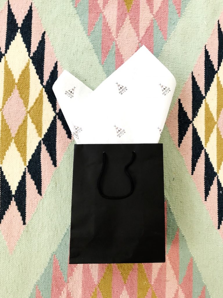 How do you use the custom tissue paper? We use our custom tissue paper at these events as tissue for the gift bags we give people when they purchase from us. We put every purchase in a nice, shiny black gift bag and top it with Modern Mija tissue. We get so many compliments on the packaging, and people who are buying gifts for loved ones truly appreciate it because their gift is purchased ready to give.
