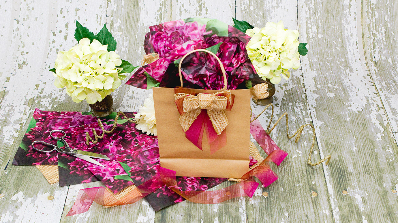 They said, “Don’t let a boring exterior mask the uniqueness of your digitally printed gift. You can print the whole bundle, with printed wrapping paper or even tissue paper. This hydrangea pattern from Digiwrap, for example, was printed with a modified digital offset printer. “